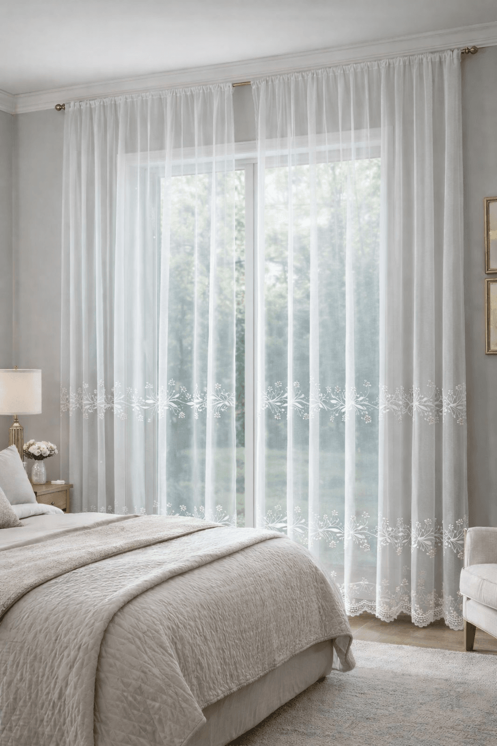 Najbardziej charakterystycznym elementem firany U99 są dwa subtelne pasy haftu, rozmieszczone w perfekcyjnej odległości, tworzące harmonijną linię wizualną. Haft jest lekki, wysublimowany, pełen mikrodetali – idealny dla wnętrz, gdzie liczy się równowaga i estetyka premium.