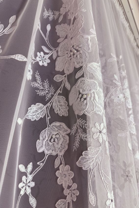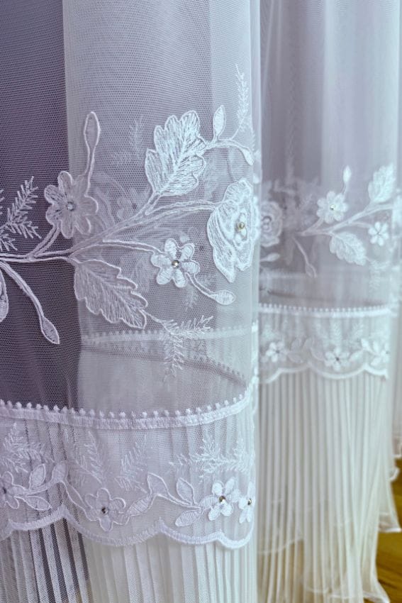 Firana Bloom Cascade z kwiatowym haftem i plisowaną spódniczką to połączenie włoskiego kunsztu, subtelnego haftu i delikatnych perełek, które razem tworzą obraz pełen światła i lekkości.