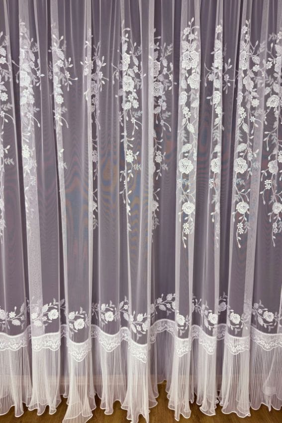 Ten kwiatowy motyw sprawia, że firana wygląda jak kaskada natury spływająca w dół okna – subtelna, lekka i romantyczna.
