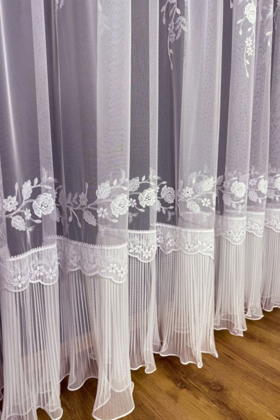 Firana Bloom Cascade z kwiatowym haftem i plisowaną spódniczką to niezwykłe połączenie elegancji, naturalności i nowoczesnego luksusu.
