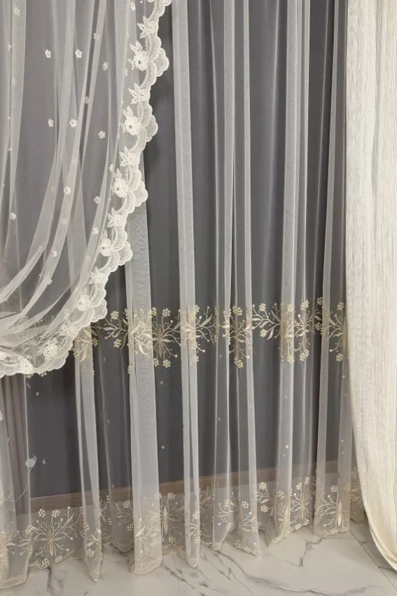 Najbardziej charakterystycznym elementem firany U99 są dwa subtelne pasy haftu, rozmieszczone w perfekcyjnej odległości, tworzące harmonijną linię wizualną. Haft jest lekki, wysublimowany, pełen mikrodetali – idealny dla wnętrz, gdzie liczy się równowaga i estetyka premium.