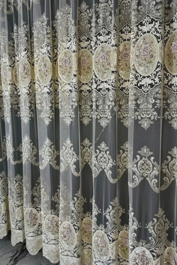 Model S40 to coś więcej niż firana – to prawdziwe dzieło sztuki użytkowej. Stworzona z delikatnej siatki w odcieniu ciepłego ecru, zdobiona welurowymi lustrami, finezyjną gipiurą oraz kwiatami 3D z cyrkoniami, przyciąga spojrzenia i nadaje wnętrzu aurę luksusu.