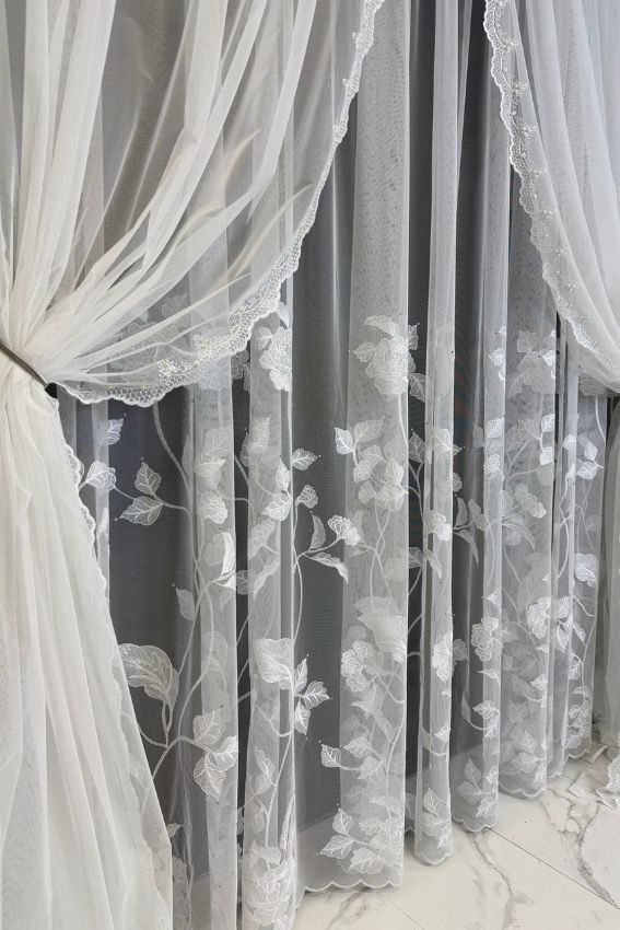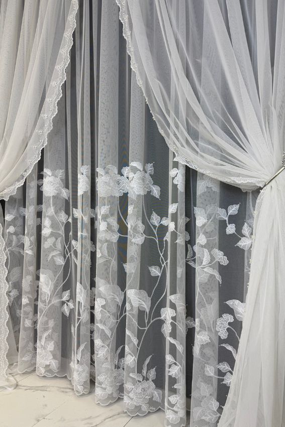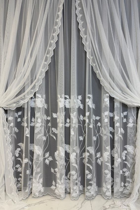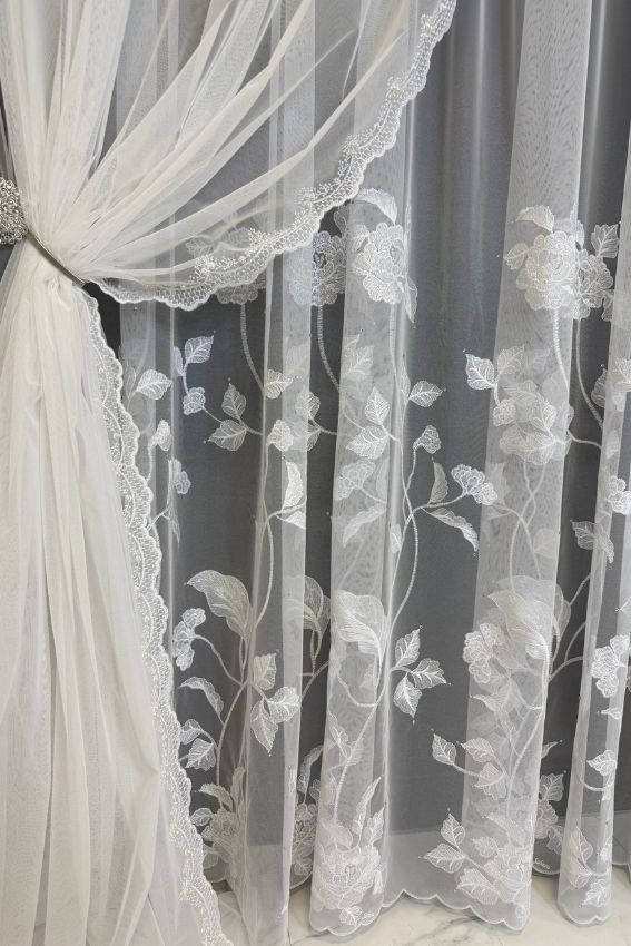 Firana Rose Garden Elegance – haftowane kwiaty na siatce tureckiej z możliwością zamówienia boków dekoracyjnych