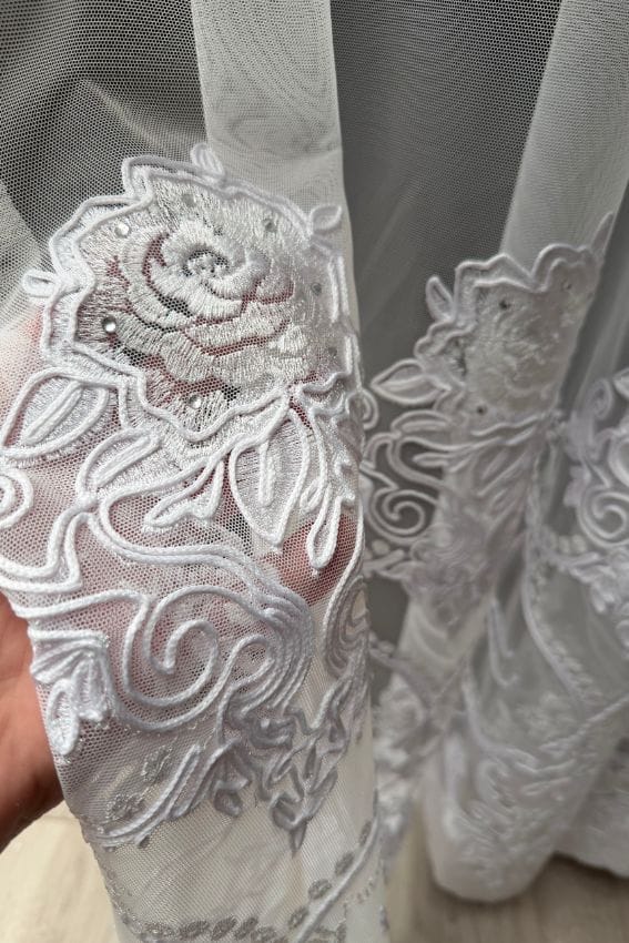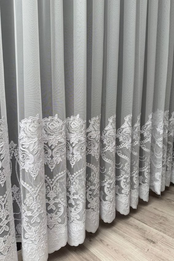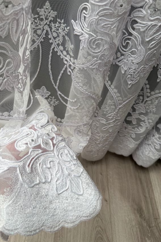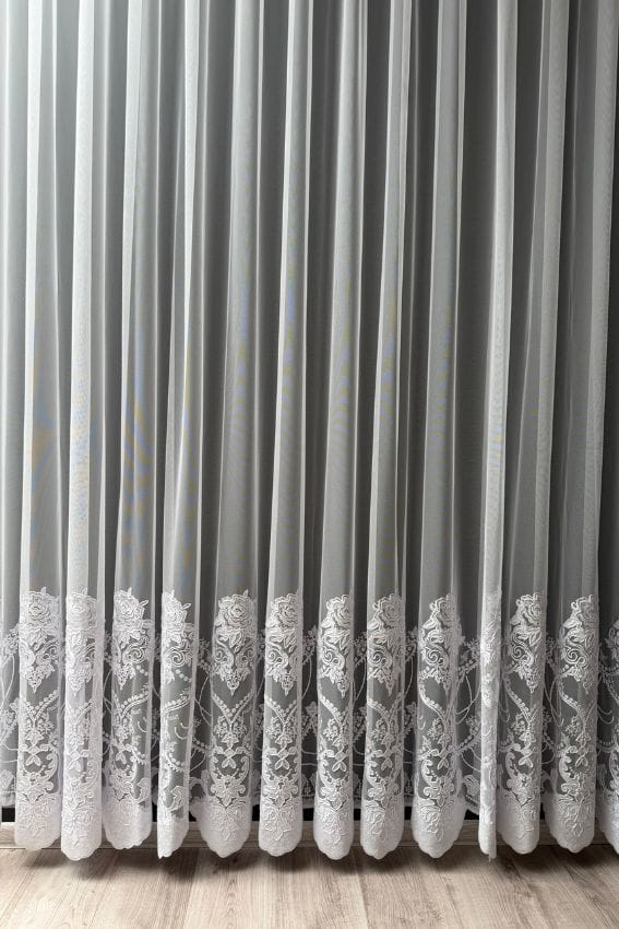 Najbardziej charakterystycznym elementem tej firany jest bogaty haft w dolnej części z dodatkiem cyrkonii, które nadają dekoracji wyjątkowego charakteru. Delikatne błyski światła sprawiają, że firana wygląda efektownie zarówno w ciągu dnia, jak i wieczorem przy oświetleniu sztucznym.
