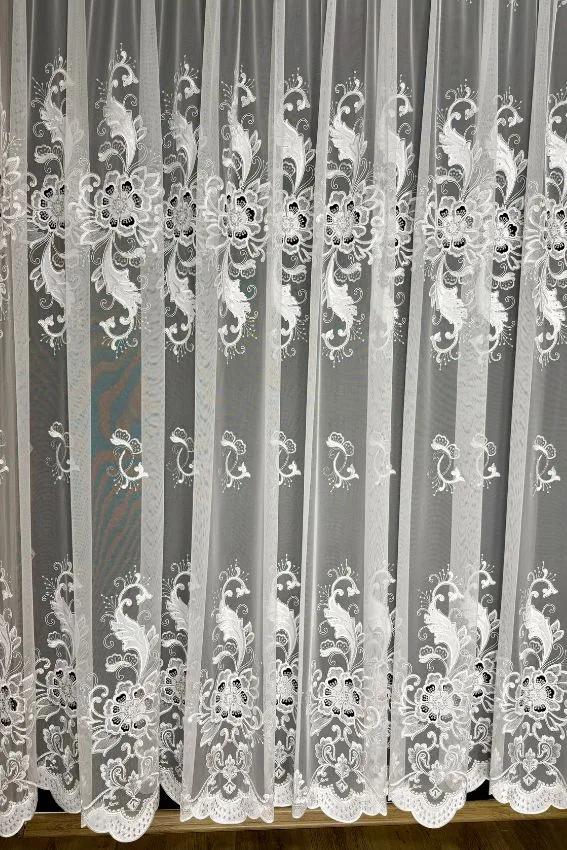 Firana włoska biała siatka z wycinanymi kwiatami i srebrnymi nićmi wygląda niczym haft rzeźbiony światłem, gdzie każdy kwiat jest jak maleńkie dzieło sztuki.