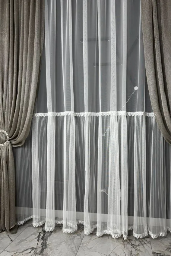 Dolna spódniczka została wykonana z tej samej tkaniny co główna część firany, dzięki czemu tworzy naturalne przedłużenie całości.
