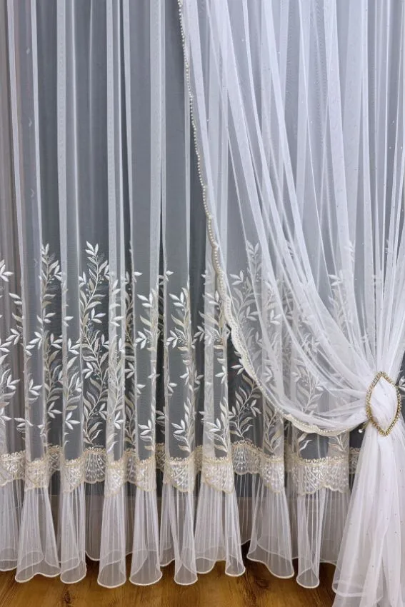 Firana ze złotym haftem, cyrkoniami i dekoracyjną spódniczką to połączenie delikatności mlecznej bieli, luksusu złota i blasku cyrkonii. Wykonana z włoskiej siatki premium, ozdobiona dekoracyjną spódniczką, stanowi idealne dopełnienie wnętrz w stylu glamour, klasycznym i modern elegance.