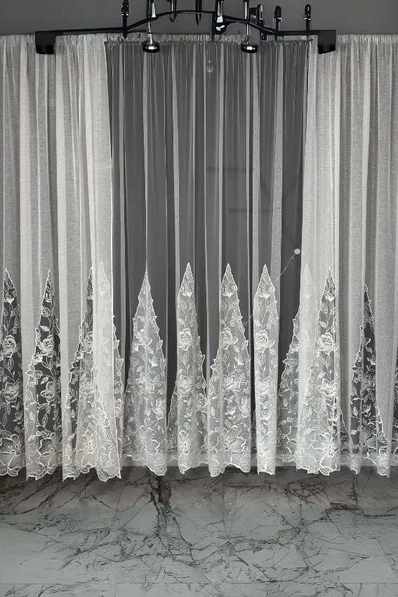 Model S29 to firana, która łączy w sobie lekkość włoskiej siatki i elegancję haftu z delikatnymi akcentami w odcieniach srebra i brązu. Jej mlecznobiały kolor wprowadza do wnętrza aurę świeżości i harmonii, a haftowane wzory ozdobione cyrkoniami oraz złotą nicią nadają aranżacji luksusowego charakteru.